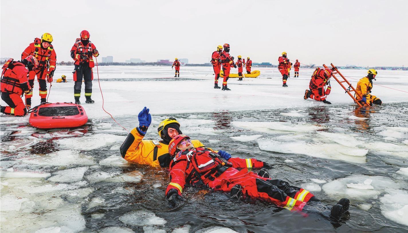 圖為消防救援人員正在開展冰上救援訓(xùn)練。(記者 趙敬東 攝)