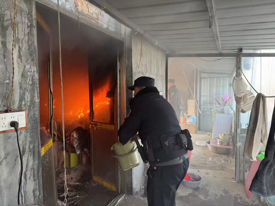 1月23日10時(shí)58分,臨清市公安局松林派出所接到群眾報(bào)警:“養(yǎng)豬場廠房起火?!被鹎榫褪敲睿拥矫詈?,民警趙力志、郭金安、張廣濱及輔警陳柏宇攜裝備火速馳援,11時(shí)04分即抵達(dá)現(xiàn)場。彼時(shí),3間自住房烈焰沖天、濃煙滾滾,火苗已引燃路邊車輛,緊鄰的豬舍岌岌可危。