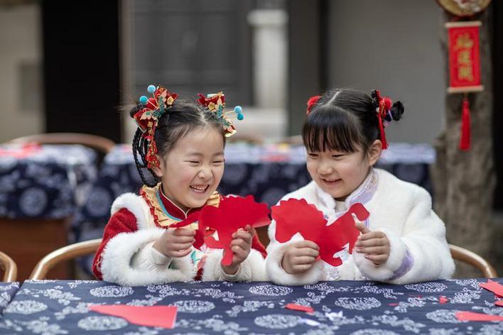 2月2日,在江蘇省興化市昭陽(yáng)街道的畢飛宇工作室內(nèi),興化市昭陽(yáng)湖幼兒園的孩子們?cè)诶蠋煹闹笇?dǎo)下創(chuàng)作以生肖馬為主題的剪紙。