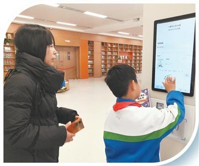 雄安圖書館內(nèi),小學(xué)生通過(guò)智能書柜檢索圖書。人民網(wǎng)記者 孫博洋攝