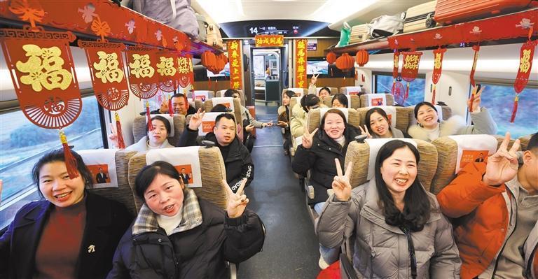 2月19日,務(wù)工旅客在G4840次務(wù)工定制高鐵專列上合影。王超攝(中經(jīng)視覺)