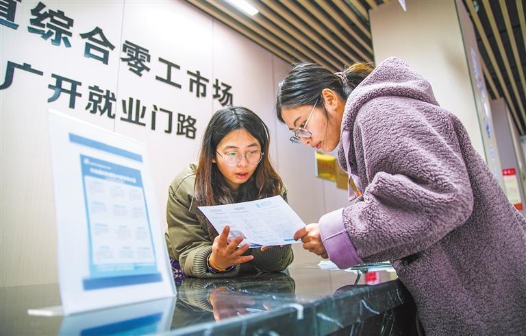 2月27日,浙江省湖州市德清縣阜溪街道綜合零工市場(chǎng)大廳,工作人員向求職者介紹靈活就業(yè)相關(guān)信息。王樹成攝(中經(jīng)視覺)