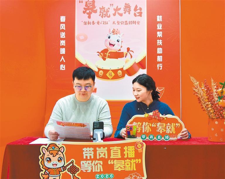 2月27日,江蘇省如皋市2026年“春風(fēng)行動(dòng)”高校畢業(yè)生專場(chǎng)招聘會(huì),工作人員通過社交平臺(tái)直播招聘信息。吳樹建攝(中經(jīng)視覺)