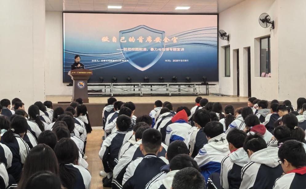 為進一步筑牢校園安全防線,切實增強未成年人法治意識和自我保護能力,3月9日,湖南省湘潭市湘鋼一中教育集團七中校區(qū)邀請湘潭市公安局岳塘分局板塘派出所民警張雨茜進校園,開展以“做自己的首席安全官”為主題的法治安全宣講活動。活動聚焦防范校園欺凌、暴力侵害及性侵害等重點內容,從源頭上預防和減少侵害未成年人案件發(fā)生。