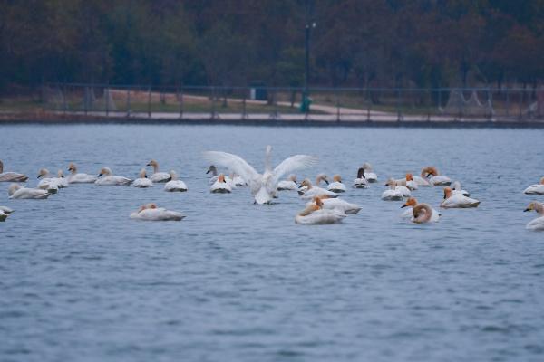 天鵝的持續(xù)到訪,已成為當地群眾最期待的“年度之約”?!?021年之前也曾見過天鵝,但多為三兩只,當時誤以為是家養(yǎng)禽類?!背砉珗@鍛煉的市民張先生感慨。家住公園附近的盧先生補充說:“此次天鵝凌晨5點多飛抵,老伴兒聽到天鵝的叫聲,便知道它們來了,我們期盼已久?!睋私?,除白天鵝外,赤麻鴨、綠頭鴨、鳳頭??等國家二級保護動物也常在此棲息,成為當地生物多樣性保護的生動寫照。