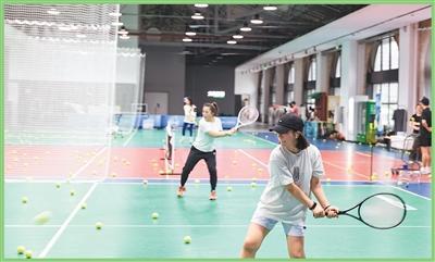 市民在貴州省貴陽市“新印1950”文創(chuàng)街區(qū)里的網(wǎng)球場鍛煉?!靶掠?950”曾是貴州新華印刷廠的老廠區(qū)。王劍攝(人民視覺)