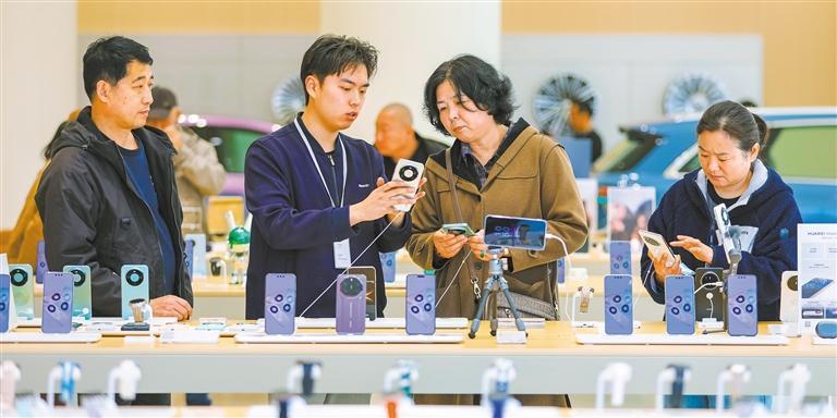 3月25日,山東省青島市樂(lè)客城華為智能生活館,消費(fèi)者在選購(gòu)手機(jī)等“國(guó)補(bǔ)”產(chǎn)品。張鷹 攝(中經(jīng)視覺(jué))