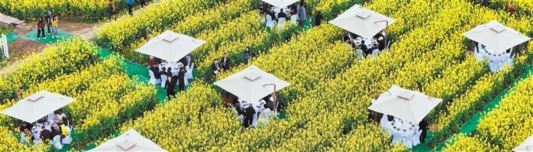 3月13日,游客在四川省南充市蓬安縣睦壩鎮(zhèn)武勝村油菜花田品嘗“花田席”。劉永紅 攝(中經(jīng)視覺(jué))