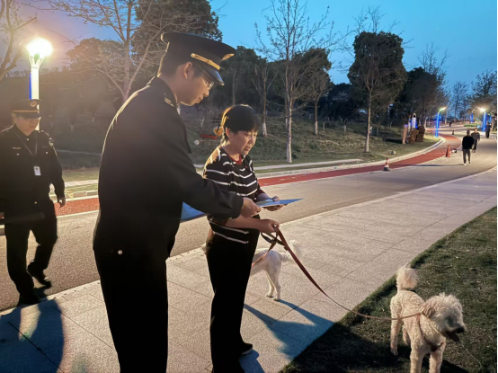 當(dāng)晚,執(zhí)法人員攜帶文明養(yǎng)犬宣傳單頁(yè),在橋西岸路、中山路、橋東岸路等城區(qū)重點(diǎn)路段開(kāi)展集中宣傳與整治。在鳳山體育公園門(mén)口,不少市民帶著寵物散步消食。執(zhí)法人員巡查時(shí)發(fā)現(xiàn),一名中年男子牽著一只犬只,另有兩只犬只未牽繩隨行,在人群中自由穿梭。“白天在家關(guān)了一天,晚上出來(lái)遛個(gè)彎,小狗這么乖,肯定不會(huì)咬人。”面對(duì)執(zhí)法人員,男子滿不在乎地解釋。