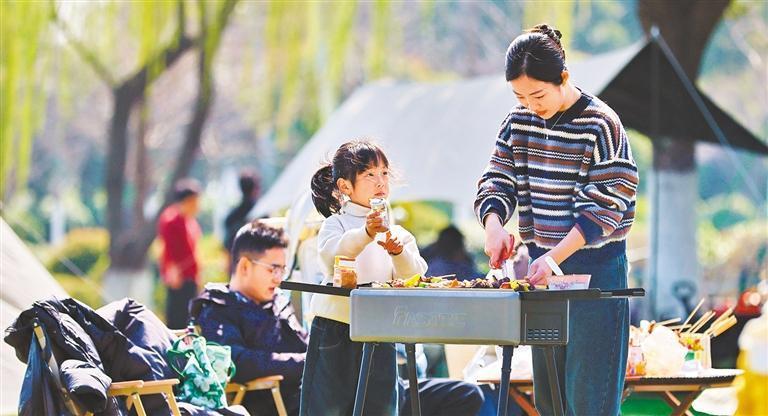 3月14日,浙江省嘉興市南湖區(qū)一公園綠地,市民在露營燒烤。金鵬 攝(中經(jīng)視覺)