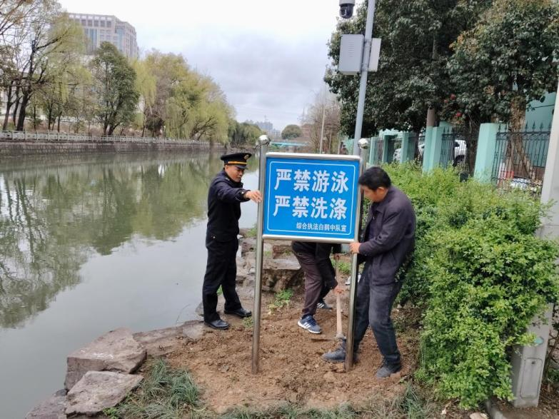 執(zhí)法人員在錢塘河景觀河岸設(shè)置提示牌