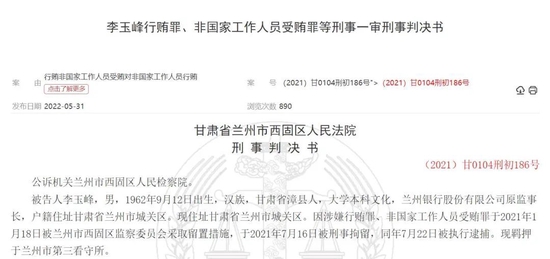 2021年3月,李玉峰因“個(gè)人原因”從蘭州銀行辭職。從判決書(shū)透露的時(shí)間線來(lái)看,2021年1月18日,李玉峰已被蘭州市西固區(qū)監(jiān)察委員會(huì)采取留置措施,并于2021年7月16日被刑事拘留,同年7月22日被執(zhí)行逮捕。