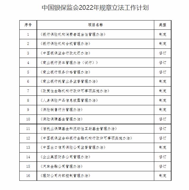 日前,銀保監(jiān)會公布2022年規(guī)章立法工作計劃。計劃包括16項內(nèi)容,其中修訂計劃8項,制定計劃8項。