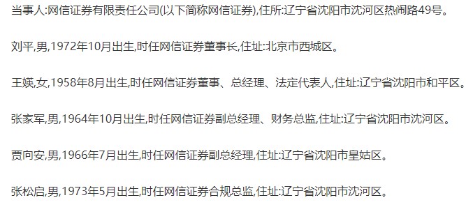行政處罰決定書顯示,網(wǎng)信證券及時任董事長劉平,時任董事、總經(jīng)理、法定代表人王媖,時任副總經(jīng)理兼財務(wù)總監(jiān)張家軍,時任網(wǎng)信證券副總經(jīng)理賈向安,時任合規(guī)總監(jiān)張松啟等均被證監(jiān)會警告并處以罰款。
