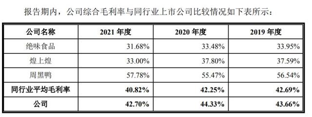 不過,德州扒雞的毛利率在行業(yè)內處于較高水平。招股書顯示,2019年至2021年,德州扒雞綜合毛利率分別為 43.66%、44.33%、42.70%,低于周黑鴨,高于絕味食品和煌上煌。其中2021年,煌上煌、周黑鴨、絕味食品的毛利率分別為33.00%、57.78%、31.68%。