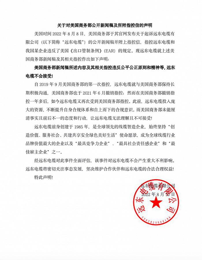8月11日消息,遠(yuǎn)東電纜有限公司發(fā)布關(guān)于對(duì)美國(guó)商務(wù)部公開(kāi)新聞稿及所附指控信的聲明稱(chēng),美國(guó)商務(wù)部新聞稿所述內(nèi)容及其相關(guān)指控違反公平公正原則和精神等,遠(yuǎn)東電纜不會(huì)接受。