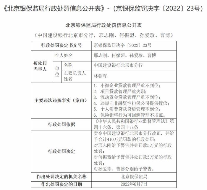 近日,中國銀行保險(xiǎn)監(jiān)督管理委員會(huì)網(wǎng)站顯示,中國建設(shè)銀行北京分行因小微企業(yè)貸款管理嚴(yán)重不到位、項(xiàng)目貸款管理嚴(yán)重失職、流動(dòng)資金貸款管理嚴(yán)重不到位、違規(guī)向非融資性擔(dān)保公司提供授信、個(gè)人消費(fèi)貸款貸后管理不到位、保險(xiǎn)銷售行為可回溯管理不規(guī)范等,被北京銀保監(jiān)局責(zé)令改正,并罰款410萬元,給予邢志剛警告并處罰款5萬元、給予何振盟警告并處罰款5萬元的行政處罰,并對孫愛珍、曹博給予?警告。
