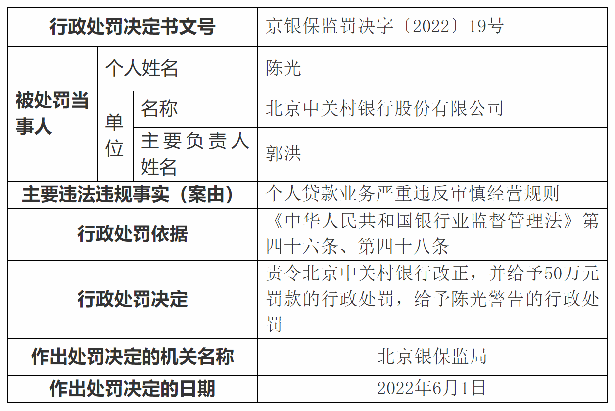據(jù)銀保監(jiān)會網(wǎng)站消息,近日北京銀保監(jiān)局對北京中關(guān)村銀行開出罰單,針對個人貸款業(yè)務(wù)嚴(yán)重違反審慎經(jīng)營規(guī)則的違法違規(guī)行為,責(zé)令該行改正,罰款50萬元,并對責(zé)任人陳光進(jìn)行警告。