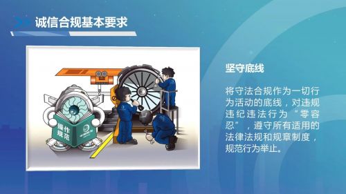 誠信鑄心,合規(guī)立行。中國航發(fā)深入貫徹習(xí)近平法治思想,落實(shí)全面依法治國戰(zhàn)略,始終堅持誠信合規(guī)經(jīng)營,以誠信涵養(yǎng)健康產(chǎn)業(yè)生態(tài),以合規(guī)凝聚磅礴發(fā)展動力,推動航空發(fā)動機(jī)事業(yè)高質(zhì)量發(fā)展?!吨袊桨l(fā)誠信合規(guī)準(zhǔn)則》(以下簡稱《準(zhǔn)則》)作為集團(tuán)合規(guī)管理頂層規(guī)范,為全集團(tuán)誠信合規(guī)經(jīng)營提供了基本的行動指南,對于打造誠信合規(guī)文化、不斷提升集團(tuán)誠信合規(guī)經(jīng)營管理水平具有重要意義。