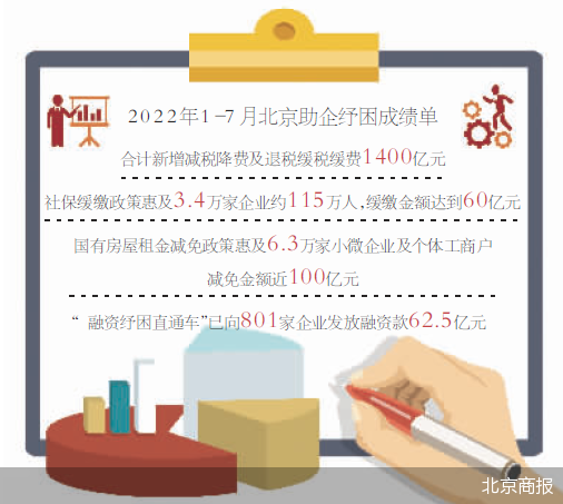 “截至8月1日,北京今年合計新增減稅降費及退稅緩稅緩費1400億元;社保緩繳政策惠及3.4萬家企業(yè)約115萬人,緩繳金額達(dá)到60億元;國有房屋租金減免政策惠及6.3萬家小微企業(yè)及個體工商戶,減免金額近100億元;“融資紓困直通車”已向801家企業(yè)發(fā)放融資款62.5億元?!贝鞣f介紹道。