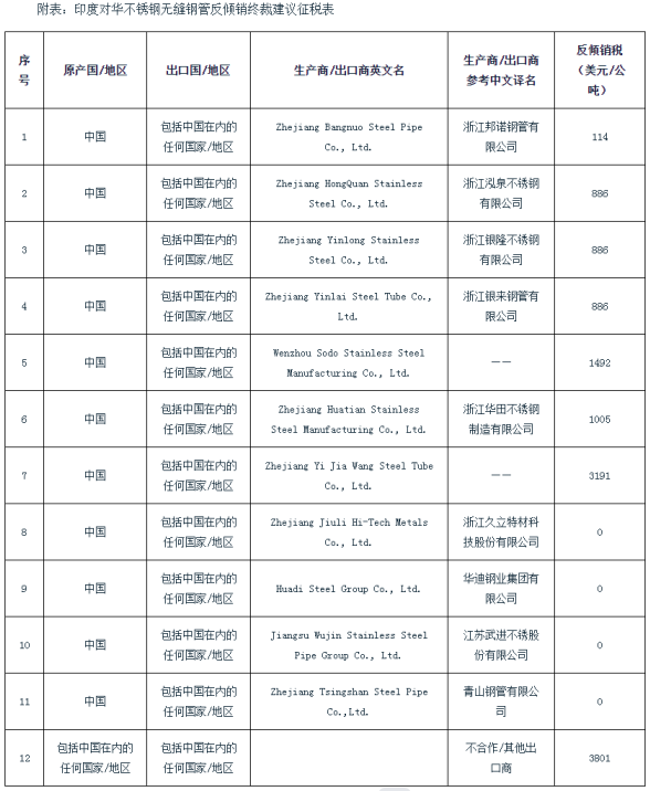 2022年9月23日,印度商工部發(fā)布公告,對(duì)原產(chǎn)于或進(jìn)口自中國(guó)的直徑小于等于6英寸的不銹鋼無(wú)縫鋼管(Stainless-steel Seamless Tubes & Pipes)作出反傾銷終裁,建議對(duì)中國(guó)的涉案產(chǎn)品征收為期5年的反傾銷稅,稅額為0~3801美元/公噸,征稅詳情見附表(印度對(duì)華不銹鋼無(wú)縫鋼管反傾銷終裁建議征稅表)。涉案產(chǎn)品為無(wú)論是采用熱擠壓工藝或熱穿孔工藝制造,無(wú)論是作為熱加工管或冷加工管售賣,包括缺陷品、非打印品或二級(jí)品在內(nèi)的、公稱直徑不超過6英寸或與其相當(dāng)?shù)钠渌?jì)量單位的不銹鋼無(wú)縫鋼管,涉及印度海關(guān)編碼7304項(xiàng)下的產(chǎn)品。