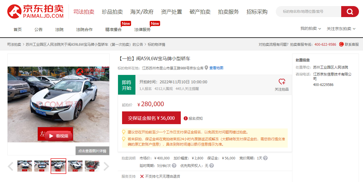 由蘇州工業(yè)園區(qū)法院處置的一臺2015年掛牌的寶馬i8,行駛里程約8萬公里,起拍價(jià)僅28萬元。寶馬i8在當(dāng)年上市之初,號稱是唯一量產(chǎn)的概念車型,要重新定義城市移動出行方式,其超酷炫的外觀設(shè)計(jì)仿佛從未來穿越而來,博得一眾車友的喜愛。據(jù)了解,該臺車因融資租賃糾紛被法院查封拍賣,已吸引了4300余人的圍觀,花落誰家讓人期待。
