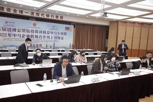 為進(jìn)一步豐富第五屆進(jìn)博會(huì)對(duì)接活動(dòng)主題,促進(jìn)中國(guó)和馬來(lái)西亞兩國(guó)間的經(jīng)貿(mào)投資往來(lái),中國(guó)銀行與中國(guó)駐馬來(lái)西亞大使館、馬來(lái)西亞中華總商會(huì)共同舉辦了“第五屆進(jìn)博會(huì)貿(mào)易投資對(duì)接會(huì)中馬專(zhuān)場(chǎng)暨2022年中馬企業(yè)跨境撮合線上對(duì)接會(huì)”(以下簡(jiǎn)稱(chēng)“中馬對(duì)接會(huì)”),邀請(qǐng)客戶依托“惠如愿·中銀e企贏”平臺(tái)開(kāi)展線上視頻洽談。江蘇中行積極落實(shí)總行工作部署,設(shè)立了南京、淮安兩處分會(huì)場(chǎng),邀約了近30家中小企業(yè)客戶參加“中馬對(duì)接會(huì)”。