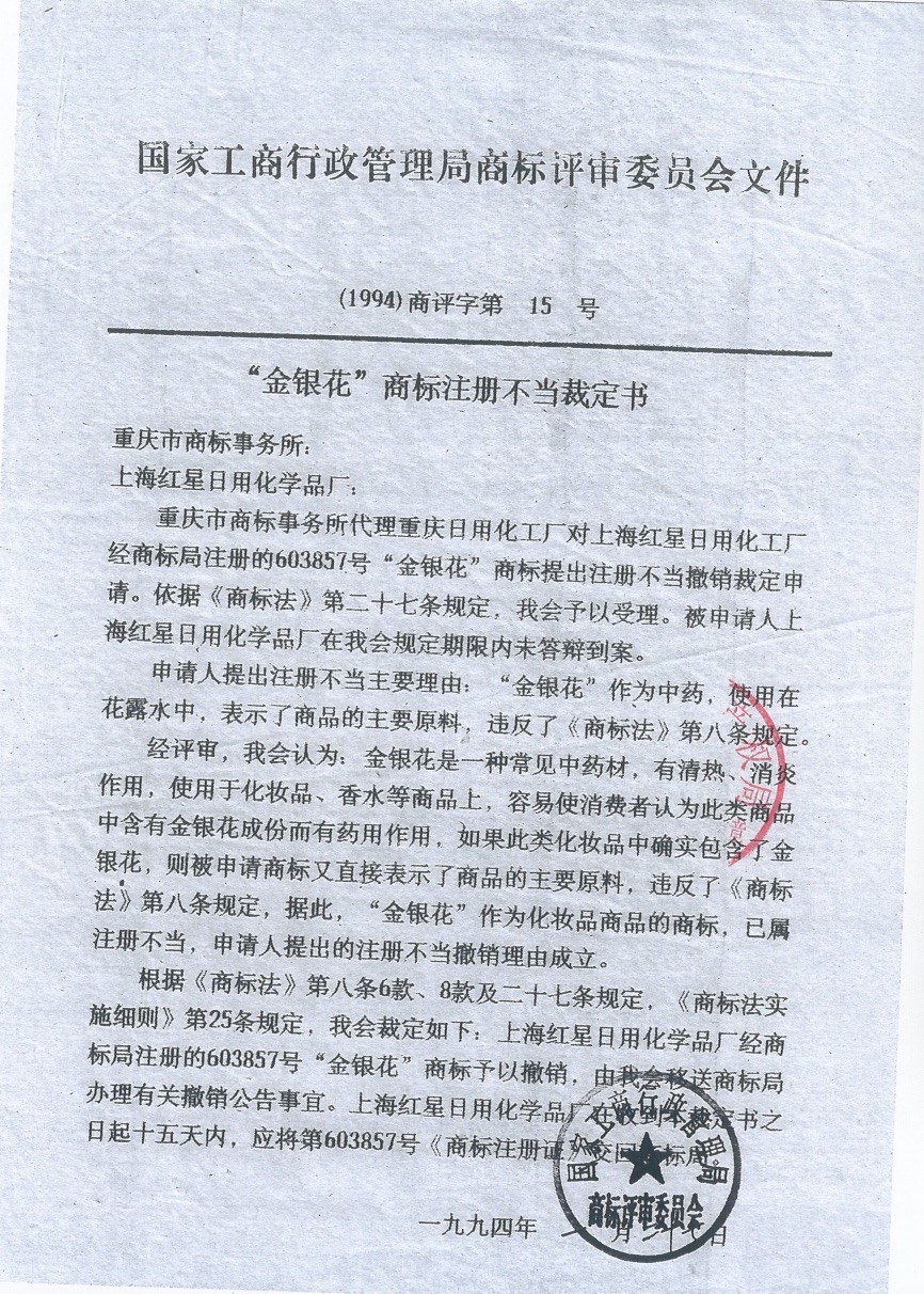 申請(qǐng)人詩妍公司向法庭展示了(1994)商評(píng)字第15號(hào)“金銀花”商標(biāo)注冊(cè)不當(dāng)裁定書。這份裁定書載明,重慶日用化工廠對(duì)上海紅星日用化工廠(金銀花商標(biāo)的注冊(cè)人)提出了商標(biāo)注冊(cè)不當(dāng)撤銷申請(qǐng),當(dāng)時(shí)的國(guó)家工商行政管理局商標(biāo)評(píng)審委員會(huì)作出裁定:對(duì)該商標(biāo)予以撤銷。