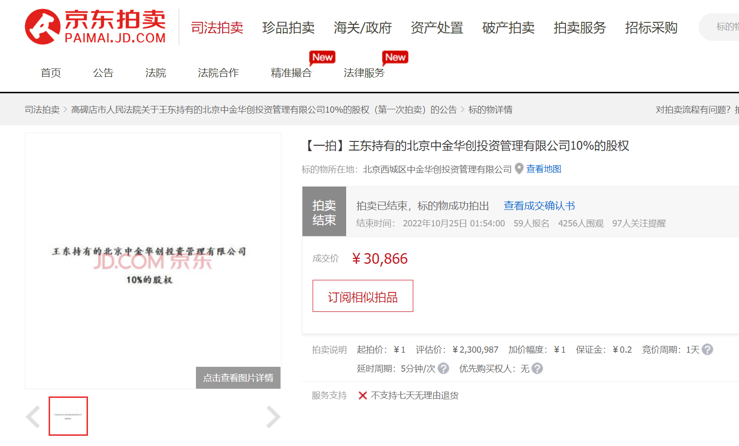 實(shí)在的價(jià)格充分激發(fā)了競(jìng)買(mǎi)人對(duì)資產(chǎn)處置標(biāo)的的熱情。某自然人持有的北京中金華創(chuàng)投資管理有限公司10%的股權(quán),以1元價(jià)格起拍,共有59人報(bào)名,經(jīng)過(guò)3202次競(jìng)價(jià),最終以3.09萬(wàn)元成交,此次拍賣(mài)也創(chuàng)造了京東拍賣(mài)11.11期間競(jìng)拍次數(shù)最多的紀(jì)錄。