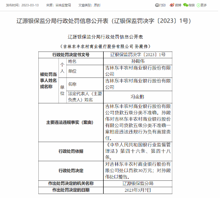 中國(guó)網(wǎng)財(cái)經(jīng)3月13日訊 今日,銀保監(jiān)會(huì)網(wǎng)站顯示,吉林東豐農(nóng)村商業(yè)銀行因貸款五級(jí)分類(lèi)不準(zhǔn)確,被遼源銀保監(jiān)分局罰款30萬(wàn)元。