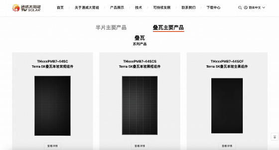 界面新聞注意到,通威太陽(yáng)能官網(wǎng)顯示了七款疊瓦主要產(chǎn)品。在去年年報(bào)中,通威股份在組件部分提到,海外市場(chǎng)重點(diǎn)聚焦歐洲、亞太、南美等終端市場(chǎng),利用各版型疊瓦、半片產(chǎn)品“矩陣”,滿足海外客戶(hù)對(duì)高效組件的差異化需求。