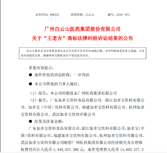 據(jù)廣藥集團(tuán)子公司白云山2018年7月公告,廣東高院關(guān)于“王老吉”商標(biāo)法律糾紛案件的一審《民事判決書》顯示,廣東加多寶飲料食品有限公司、浙江加多寶飲料有限公司、加多寶(中國)飲料有限公司、福建加多寶飲料有限公司、杭州加多寶飲料有限公司、武漢加多寶飲料有限公司(合稱為“六加多寶”)被判賠償廣藥集團(tuán)經(jīng)濟(jì)損失及合理維權(quán)費用共計人民幣14.41億元。