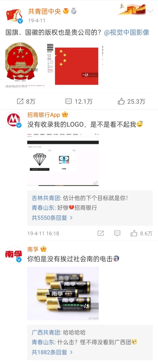 2019年4月11日,“共青團(tuán)中央”官微點(diǎn)名視覺中國(guó)并質(zhì)疑:“國(guó)旗、國(guó)徽的版權(quán)也是貴公司的?”隨后,一眾藍(lán)V排隊(duì)評(píng)論自家LOGO也被視覺中國(guó)收入囊中,甚至連歷史書上的人物圖也被視覺中國(guó)明碼標(biāo)價(jià),成為其牟利之物。