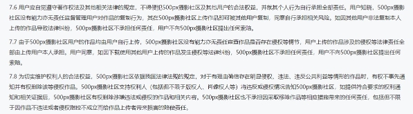 記者發(fā)現(xiàn),在視覺中國(guó)的個(gè)人供稿社區(qū)——500px攝影社區(qū)中,有這樣一條免責(zé)聲明:用戶的作品均由用戶自行上傳,500px攝影社區(qū)沒有能力亦無責(zé)任審查作品是否存在侵權(quán)等情節(jié),用戶上傳的作品涉及的侵權(quán)等法律責(zé)任全部由上傳用戶本人承擔(dān)。用戶同意,如因下載使用其他用戶上傳的作品發(fā)生侵權(quán)等法律糾紛,500px攝影社區(qū)不承擔(dān)任何責(zé)任,用戶不向500px攝影社區(qū)提出任何索賠。