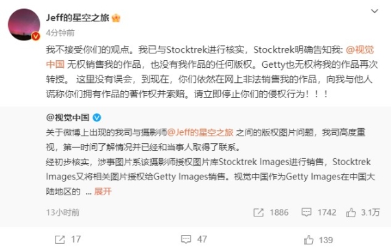 “我不接受你們的觀點(diǎn)。我已與Stocktrek進(jìn)行核實(shí),Stocktrek明確告知我: @視覺中國(guó) 無權(quán)銷售我的作品,也沒有我作品的任何版權(quán)。Getty也無權(quán)將我的作品再次轉(zhuǎn)授。這里沒有誤會(huì),到現(xiàn)在,你們依然在網(wǎng)上非法銷售我的作品,向我與他人謊稱你們擁有作品的著作權(quán)并索賠。請(qǐng)立即停止你們的侵權(quán)行為!”
