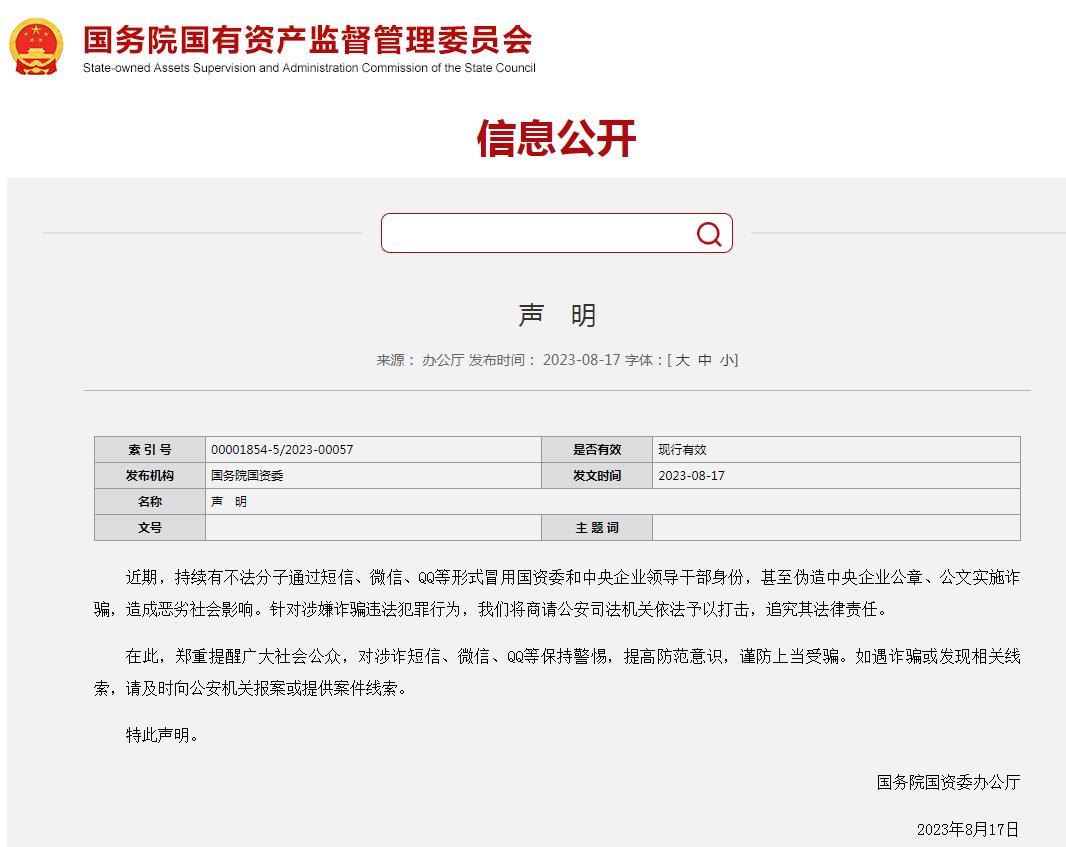 國(guó)務(wù)院國(guó)有資產(chǎn)監(jiān)督管理委員會(huì)網(wǎng)站8月17日發(fā)布的聲明內(nèi)容截圖