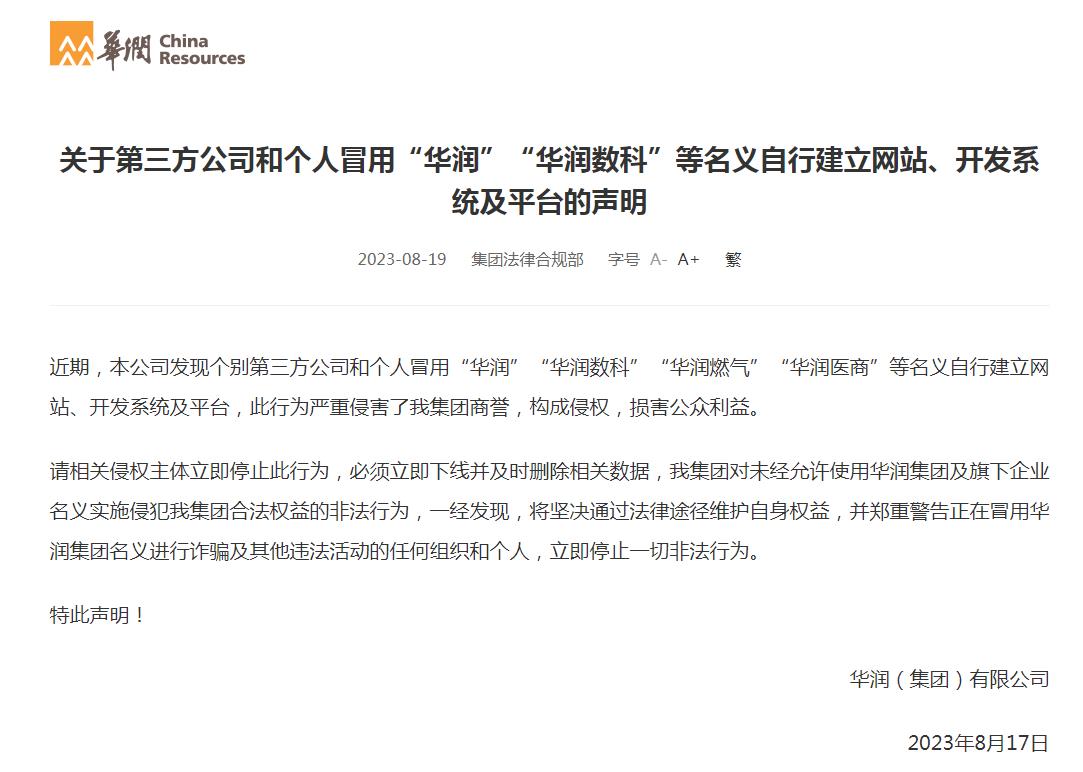 華潤(rùn)(集團(tuán))有限公司(以下簡(jiǎn)稱(chēng)“華潤(rùn)集團(tuán)”)的聲明稱(chēng),近期,公司發(fā)現(xiàn)個(gè)別第三方公司和個(gè)人冒用“華潤(rùn)”“華潤(rùn)數(shù)科”“華潤(rùn)燃?xì)狻薄叭A潤(rùn)醫(yī)商”等名義自行建立網(wǎng)站、開(kāi)發(fā)系統(tǒng)及平臺(tái),此行為嚴(yán)重侵害了華潤(rùn)集團(tuán)商譽(yù),構(gòu)成侵權(quán),損害公眾利益。