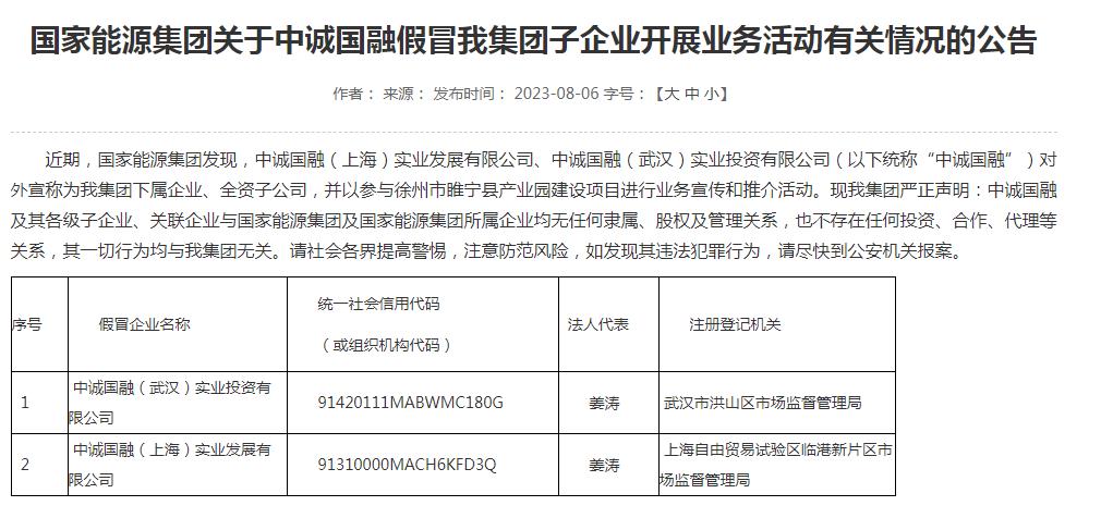 8月6日,國(guó)家能源集團(tuán)發(fā)布了關(guān)于中誠(chéng)國(guó)融假冒集團(tuán)子企業(yè)開(kāi)展業(yè)務(wù)活動(dòng)有關(guān)情況的公告。