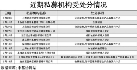 據(jù)《經(jīng)濟參考報》記者統(tǒng)計,今年8月初至9月底,中基協(xié)網(wǎng)站公布針對私募機構的紀律處分決定書38張、針對相關個人的紀律處分決定書88張,合計超120張。業(yè)內(nèi)人士分析認為,針對私募行業(yè)相關問題的處分力度較之前明顯加強。此前的6月至7月,中基協(xié)針對私募機構的紀律處分決定書僅有3張,針對相關個人的紀律處分決定書也僅有4張。