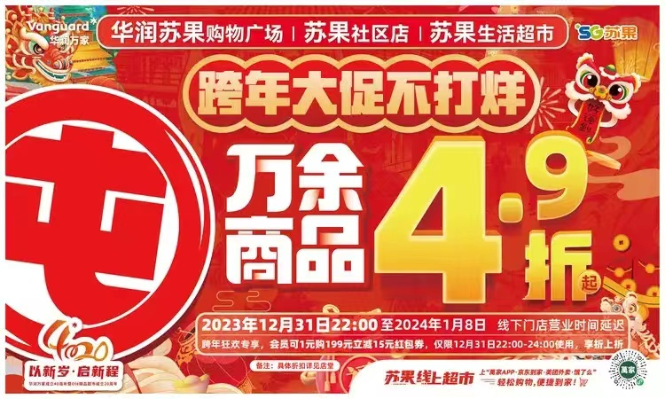 為拉動節(jié)日消費,做旺元旦市場,蘇果超市采取多重舉措集中發(fā)力,于2023年12月31日啟動“龍年囤好物,省新在萬家”萬余商品4.9折起等系列促消費活動,有效拉動元旦消費。據(jù)統(tǒng)計,自活動啟動之日至1月4日,累計已有數(shù)百萬人走進蘇果各業(yè)態(tài)門店“買買買”,實現(xiàn)2024新年開門紅。