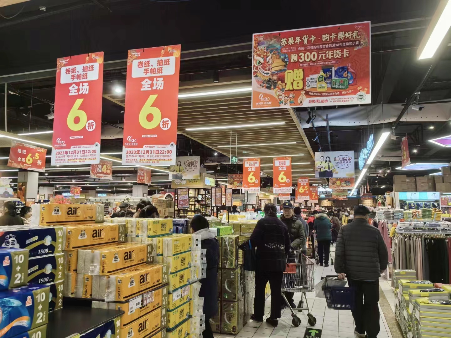 元旦期間,南京市鼓樓區(qū)一家大型蘇果門店,豐富的商品、給力的折扣,年節(jié)氛圍十分濃郁。消費者手推購物車在貨架前選購心儀的商品,同時也把“美好生活”的向往裝進了購物車。