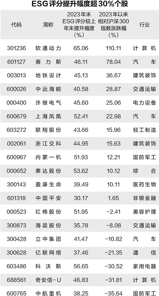數(shù)據(jù)顯示,截至昨日收盤(下同),19只ESG先鋒股2023年以來相對滬深300指數(shù)的平均超額收益率為11.9%,超六成個股跑贏滬深300指數(shù)。其中,軟通動力、賽力斯超額收益率超70%;地鐵設(shè)計、中遠(yuǎn)海能超額收益率超28%。