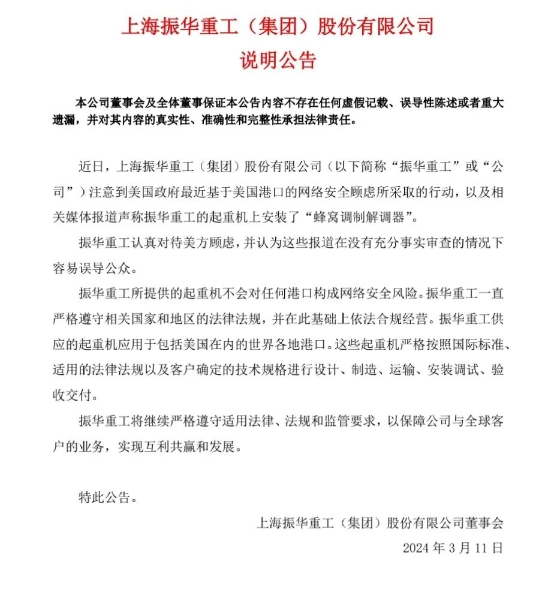 3月10日晚間,振華重工發(fā)布公告稱,公司注意到美國政府最近基于對(duì)美國港口的網(wǎng)絡(luò)安全顧慮所采取的行動(dòng),以及相關(guān)媒體報(bào)道稱振華重工的起重機(jī)上安裝了“蜂窩調(diào)制解調(diào)器”。公司強(qiáng)調(diào),其所提供的起重機(jī)不會(huì)對(duì)任何港口構(gòu)成網(wǎng)絡(luò)安全風(fēng)險(xiǎn)。公司一直嚴(yán)格遵守相關(guān)國家和地區(qū)的法律法規(guī),并在此基礎(chǔ)上依法合規(guī)經(jīng)營。