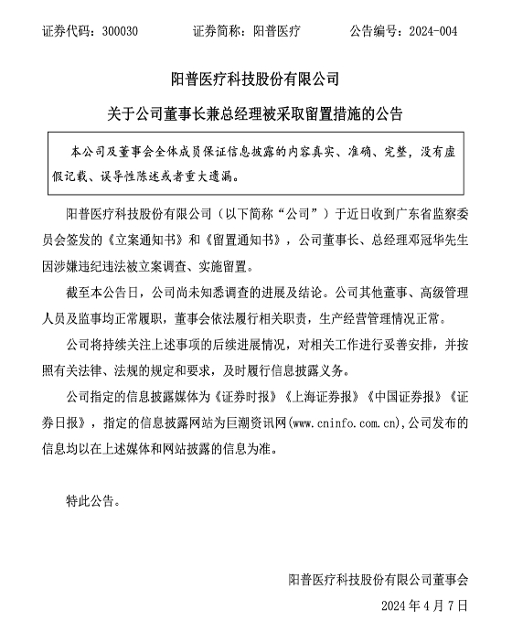 陽(yáng)普醫(yī)療董事長(zhǎng)被立案調(diào)查、實(shí)施留置