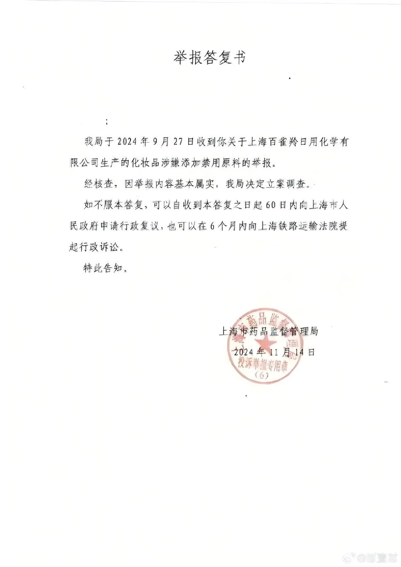 11月19日晚,有博主發(fā)文稱,百雀羚生產(chǎn)的化妝品涉嫌添加禁用原料,同時貼出了上海市藥監(jiān)局舉報答復書。該答復書蓋有上海市藥監(jiān)局投訴舉報專用章,其中提到,“經(jīng)核查,因舉報內(nèi)容基本屬實,我局決定立案調(diào)查?!痹谠撐⒉┌l(fā)布幾個小時后,“百雀羚化妝品涉嫌添加禁用原料”相關(guān)話題于11月20日早上登頂熱搜。