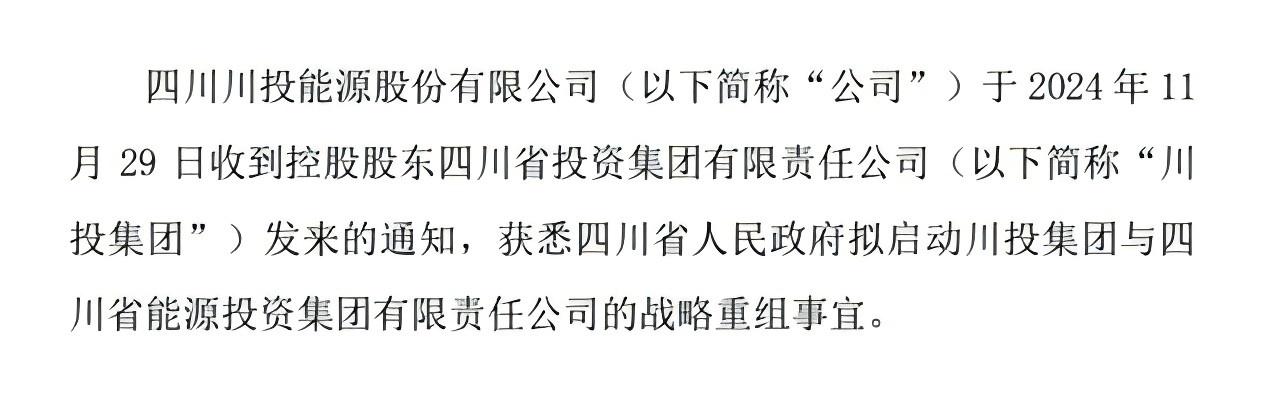 11月29日晚,川投能源、川能動(dòng)力、華海清科3家A股公司披露,公司接到通知,獲悉四川省人民政府?dāng)M啟動(dòng)四川省投資集團(tuán)有限責(zé)任公司(簡(jiǎn)稱(chēng)“川投集團(tuán)”)與四川省能源投資集團(tuán)有限責(zé)任公司(簡(jiǎn)稱(chēng)“能投集團(tuán)”)的戰(zhàn)略重組事宜。上述事宜涉及相關(guān)政府部門(mén)的批準(zhǔn),尚處于前期籌劃階段,能否獲得批準(zhǔn)存在不確定性。