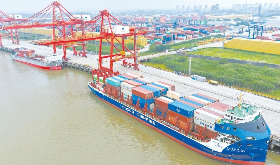 海關(guān)總署9日發(fā)布數(shù)據(jù)顯示,今年前5個(gè)月我國(guó)貨物貿(mào)易進(jìn)出口同比增長(zhǎng)2.5%。圖為9日當(dāng)天的南京港龍?zhí)陡蹍^(qū)。(視覺(jué)中國(guó))