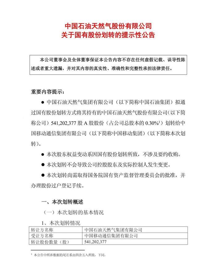 9月2日晚,中國(guó)石油(601857.SH)公告,為進(jìn)一步深化中國(guó)石油集團(tuán)與中國(guó)移動(dòng)集團(tuán)的戰(zhàn)略合作,拓寬合作領(lǐng)域,優(yōu)化公司股權(quán)結(jié)構(gòu),公司控股股東中國(guó)石油天然氣集團(tuán)有限公司(以下簡(jiǎn)稱“中國(guó)石油集團(tuán)”)擬通過(guò)國(guó)有股份劃轉(zhuǎn)方式將其持有的約5.41億股A股股份(占公司總股本的0.30%)劃轉(zhuǎn)給中國(guó)移動(dòng)通信集團(tuán)有限公司。