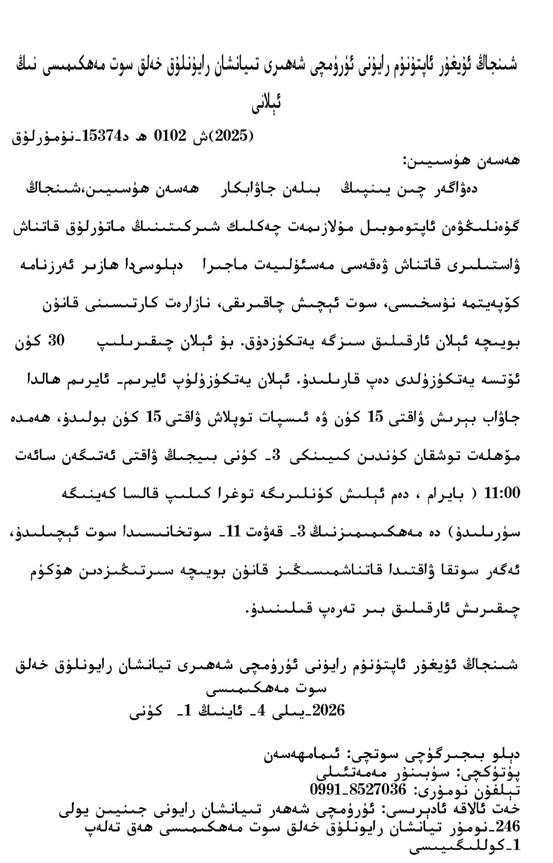 (2025)新0102民初15374號(hào) 本院受理原告陳銀平與被告艾山·玉蘇因、新疆冠領(lǐng)萬(wàn)汽車服務(wù)有限公司機(jī)動(dòng)車交通事故責(zé)任糾紛一案,因被告艾山·玉蘇因下落不明,現(xiàn)已刊登公告。