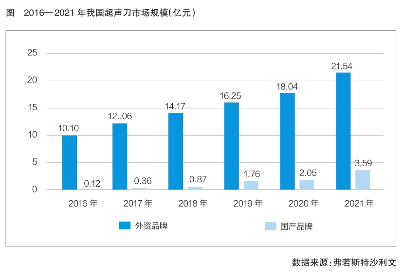弗若斯特沙利文數(shù)據(jù)還顯示,我國超聲刀市場規(guī)模已從2016年的10.22億元增長至2021年的25.13億元,年復合增長率高達19.71%;其中,國產(chǎn)品牌市場規(guī)模增速較快,已從2016年的0.12億元增長至2021年的3.59億元(詳見圖)。